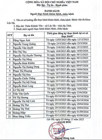 Danh sách người thực hành và người hoàn thành quá trình thực hành khám bệnh, chữa bệnh